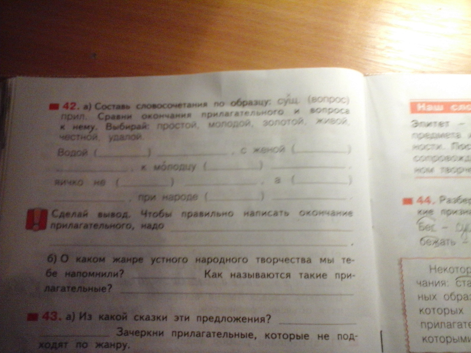 Водой(какой? )живой, с женой(какой? )молодой, к молодцу(какому) удалому, яичко не(какое) простое, а(какое)золотое