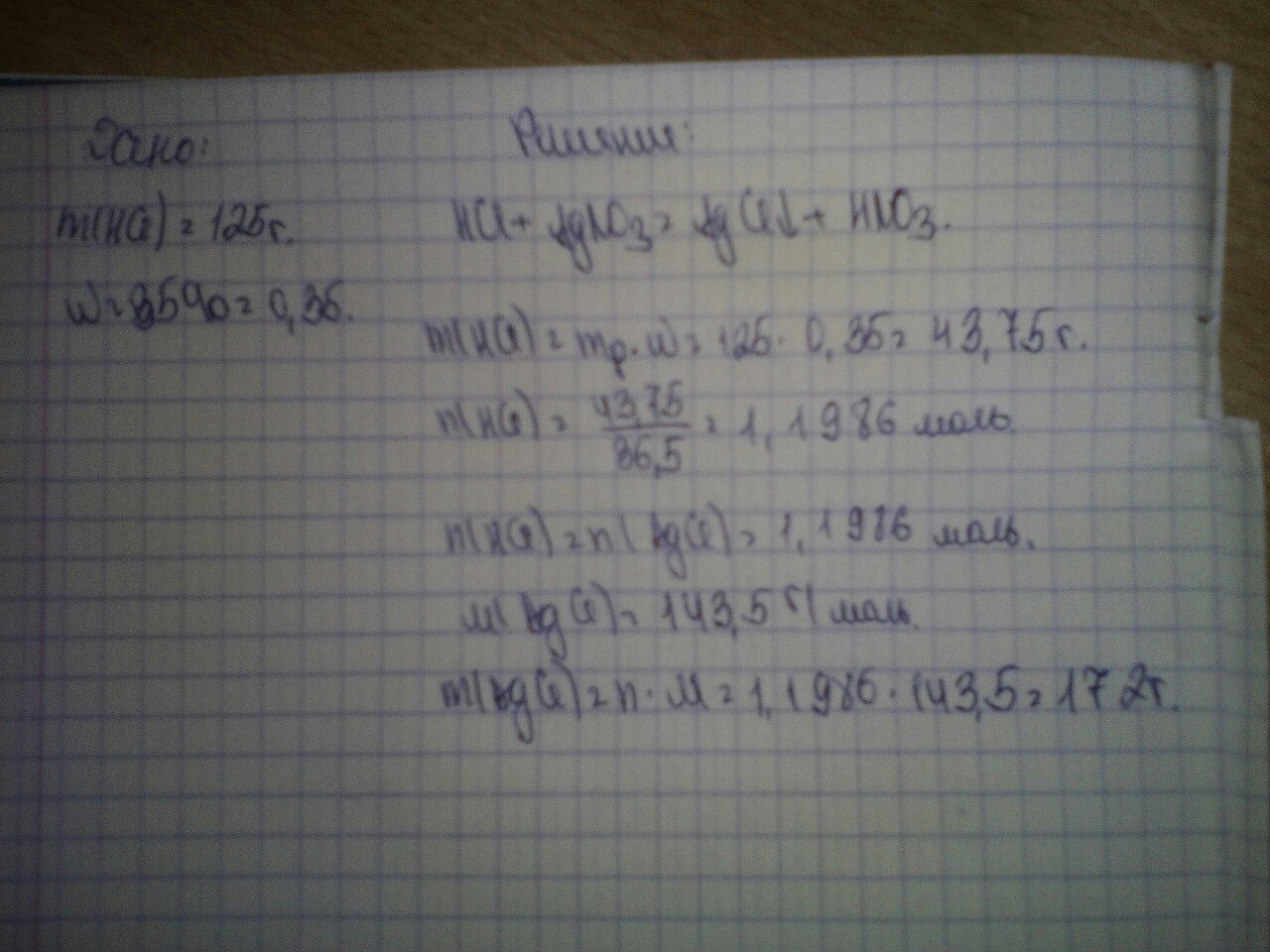 Люди добрые, помогите вычислить массу осадка, образовавшегося при сливании раствора аргентум нитрата с раствором хлоридной кислоты массой 125 г с долей растворённого вещества 35%.