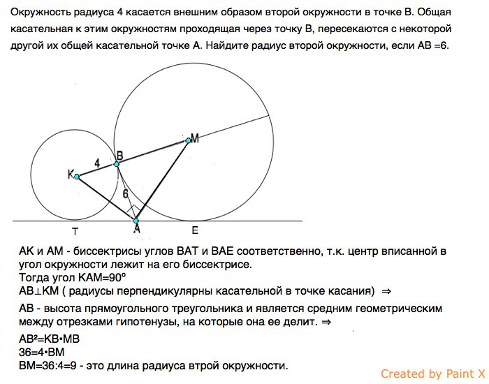 окружность радиуса 4 касается внешним образом второй окружности в точке B. Общая касательная к этим окружностям проходящая через точку B, пересекаются с некоторой другой их общей касательной точке A. Найдите радиус второй окружности, если AB =6.