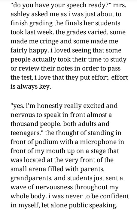 Мысль о том, чтобы стоять перед подиум с микрофоном у рта на сцене, расположенной в самой передней части маленького помещения, заполненного родителями, дедушками и бабушками, студентами, создала тревогу, волной прошедшей через все мое тело. Я никогда не была уверена в себе, тем более не говоря уже о публичных выступлениях.
