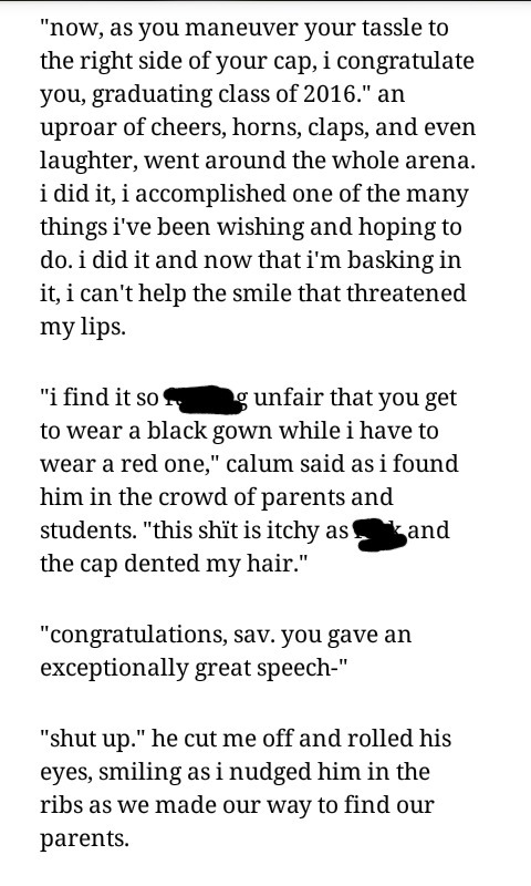 "Мне *** жаль,что тебе приходится носить чёрную мантию,в то время,как я одет в красную."Калум сказал это,как только я нашла его в толпе студентов и родителей."Эта *** кепка помяла мою причёску."