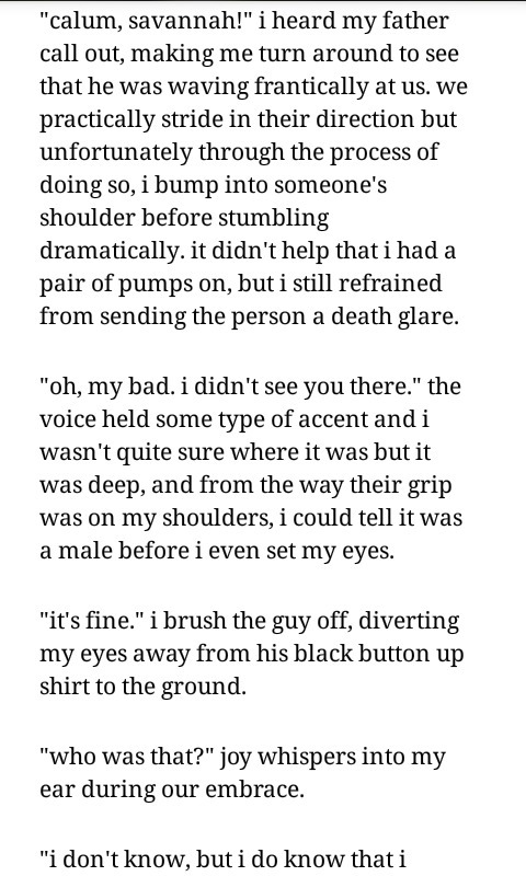 "Калум,Саванна!",звал нас отец. Этот окрик заставил меня обернуться и увидеть,что он отчаянно машет нам. Мы идём практически в их направлении,но,к несчастью,я,спотыкнувшись,врезаюсь в чьё-то плечо. На мне были надеты туфли-лодочки,но это совершенно не помогло. Я еле сдержалась,чтобы не испепелить этого человека взглядом.