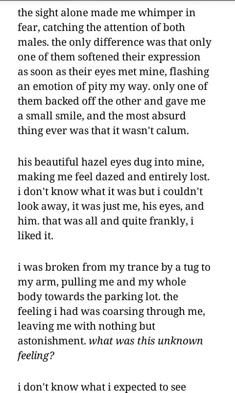 Один только взгляд заставил меня хныкать в страхе,что привлекло внимание обоих мужчин. Разница была лишь в том,что один из них смягчил свой взгляд,как только наши взгляды встретились. В них проблеснула жалость. Только один из них уступил и улыбнулся мне. И самое ужасное..это был не Калум.
