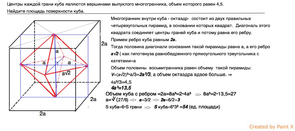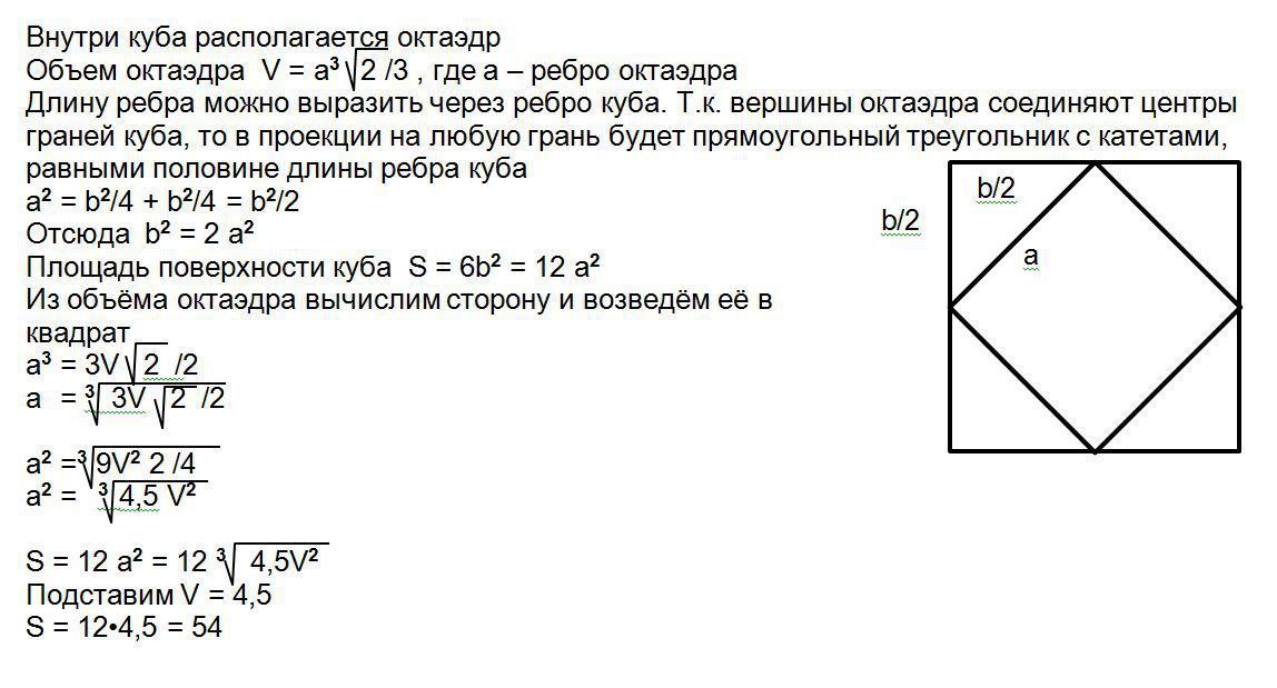 центры каждой грани куба являются вершинами выпуклого многогранника. объем которого равен 4,5.найдите площадь поверхности куба