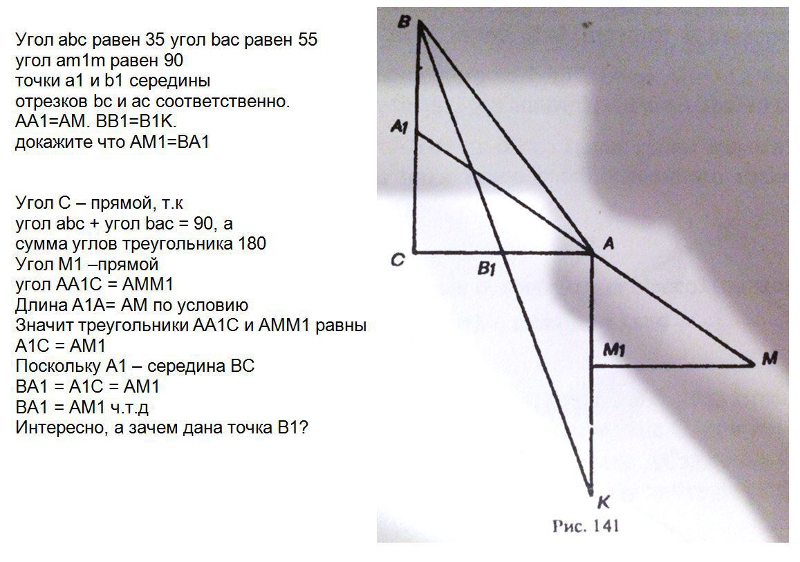 угол abc равен 35 угол bac равен 55 угол am1m равен 90 точки a1 и b1 середины отрезков bc и ac соответственно. AA1=AM. BB1=B1K. докажите что AM1=BA1