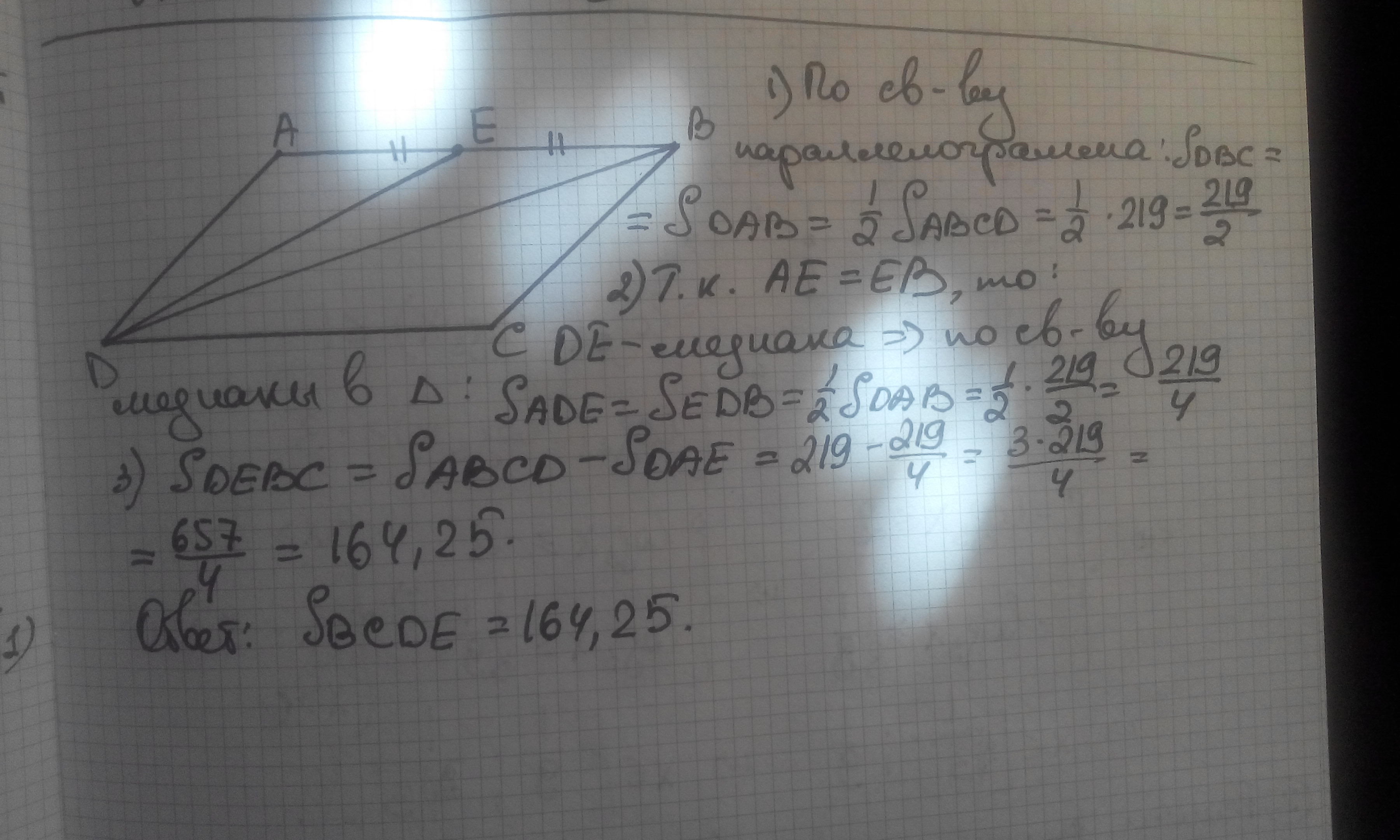 Площадь параллелограмма АВСД равна 219,точка Е-середина стороныАВ.найдите площадь трапеции ВСДЕ.
