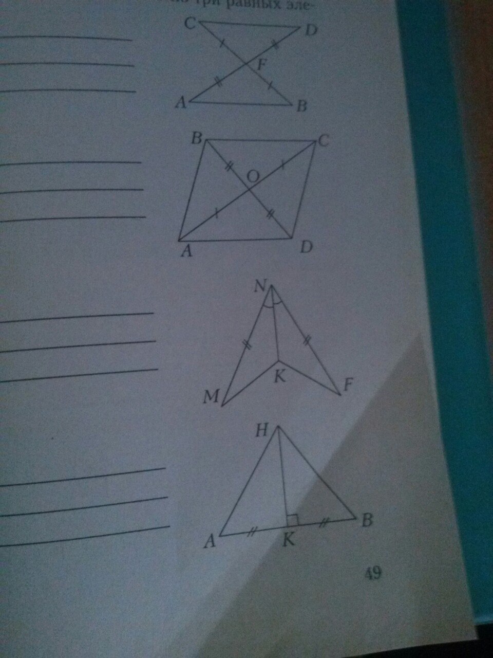 Выясните,равны ли треугольники,изоброженные на рисунках.Найдите для этого по три равных элемента