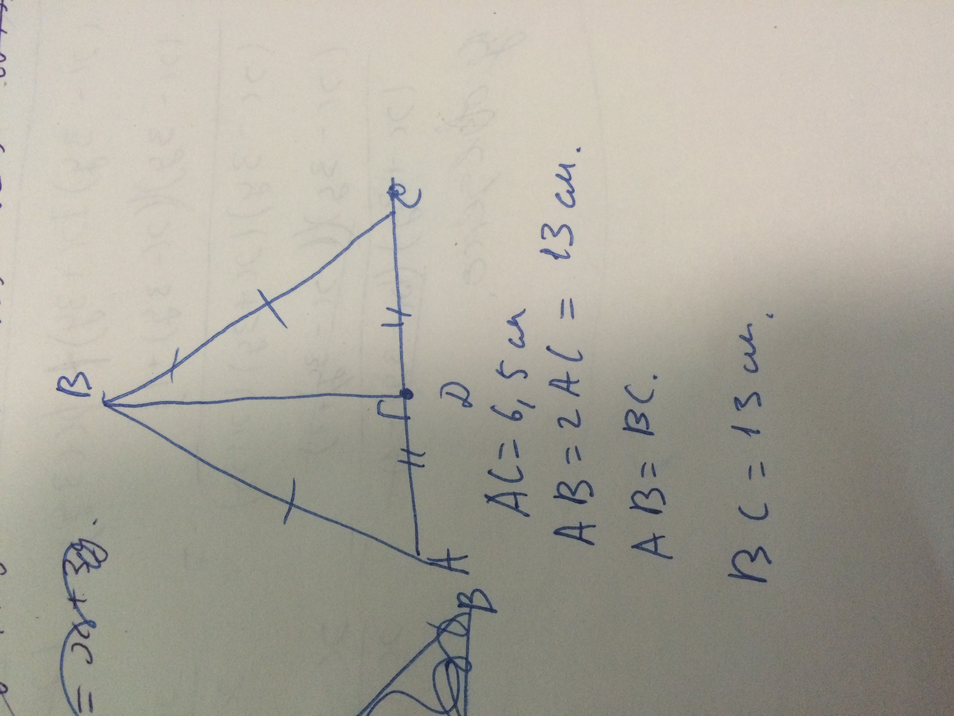 АВС – равнобедренный треугольник. Точка D - середина основания АС. Эту точку соединили с вершиной В, образовавшийся угол АDВ равен 90о. Длина стороны АС равна 6,5 см. Сторона АВ в два раза больше АС. Найдите сторону ВС.