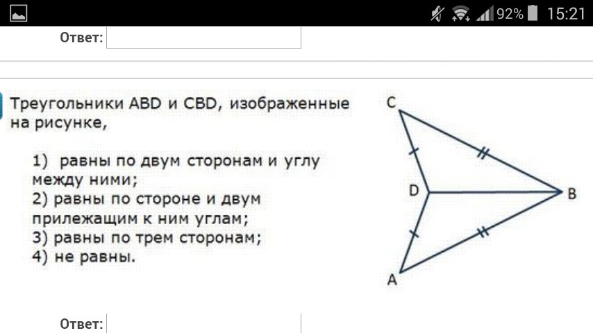 равны по 3-м сторонам,т.к. 2 стороны указаны на рисунке,что одинаковые,а третья общая