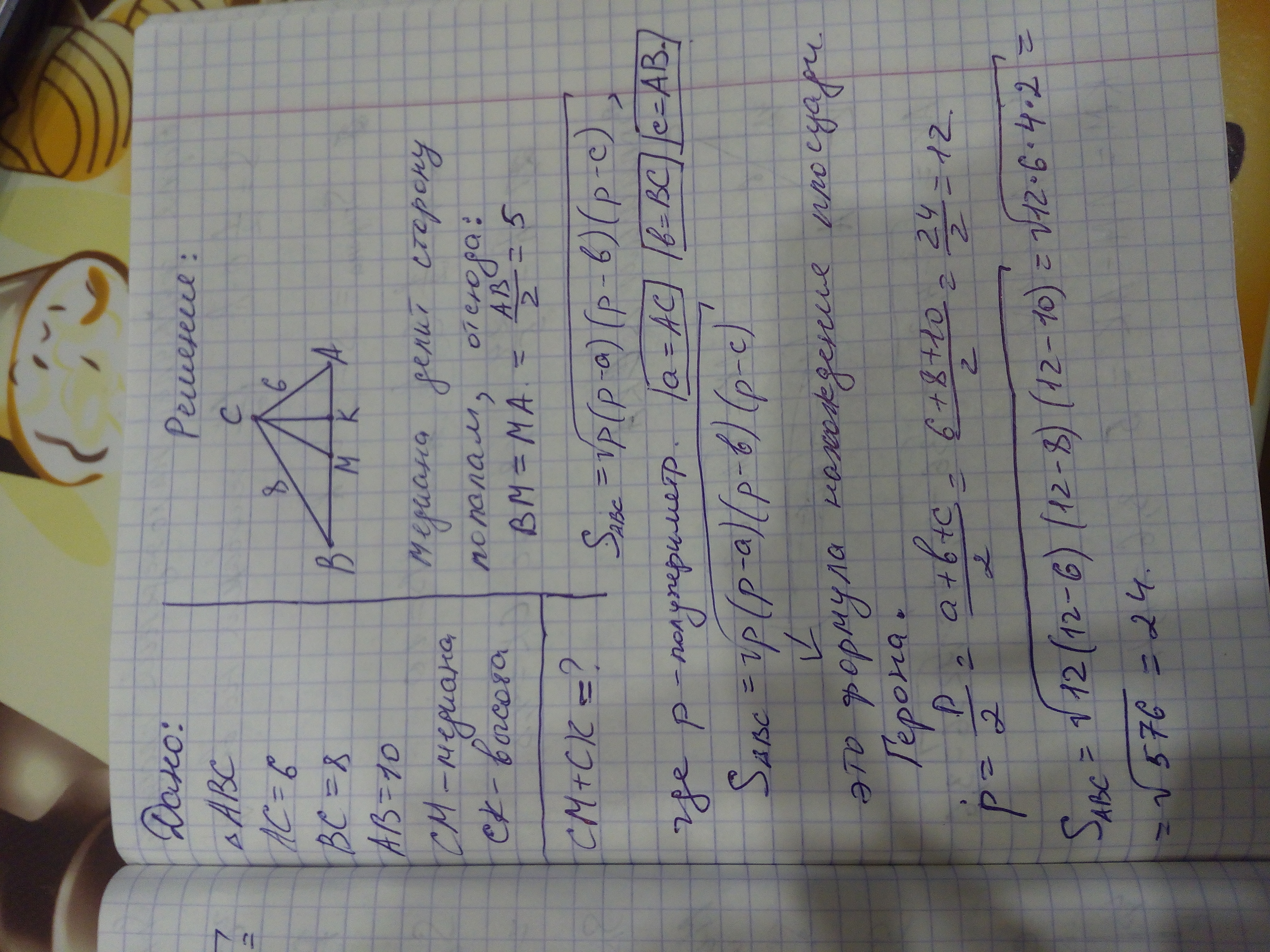 Дан треугольник АВС,длины сторон которого равны Ас=6,Вс =8,Ав=10. Из вершиныС на сторону АВ проведена медиана и опущена высота . Найдите сумму их длин
