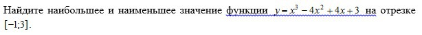 y=x^3-4x^2+4x+3; ,; ; xin [-1,3, ]\\y'=3x^2-8x+4=0\\D/4=16-12=4\\x_1=frac{4-2}{3}=frac{2}{3}; ,; ; x_2=frac{4+2}{3}=2\\y(-1)=-1-4-4+3=-6\\y(frac{2}{3})=frac{8}{27}-frac{16}{9}+frac{8}{3}+3=frac{32}{27}+3=frac{113}{27}=4frac{5}{27}\\y(2)=8-16+8+3=3\\y(3)=27-36+12+3=6\\y_{naibol.}=6\\y_{naimen.}=-6