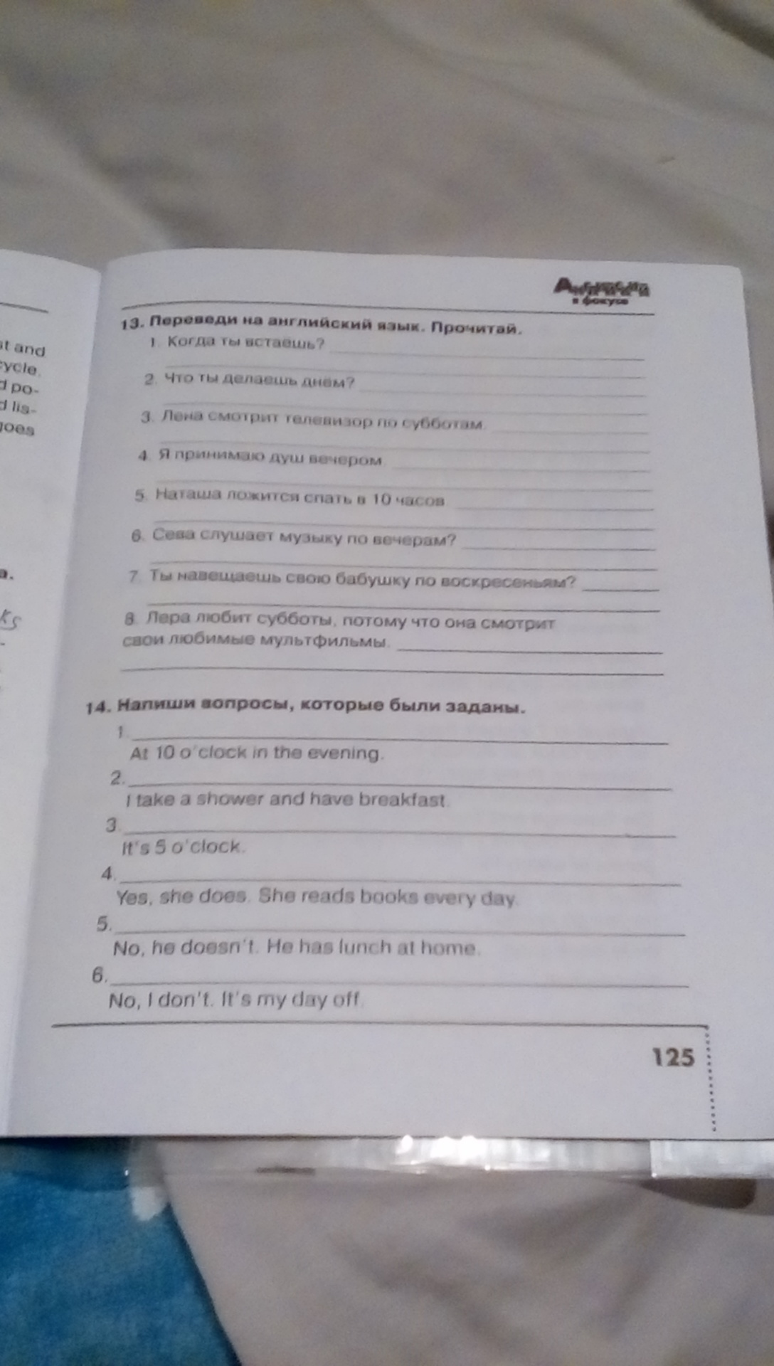 When you get up?What do you do during the day?Lena watches TV on SaturdaysI shower in the eveningNatasha to go to bed at 10 o'clock Seva listening to music in the evenings?You visit your grandmother on Sundays?Teen loves Saturdays because she's watching their favorite cartoons
