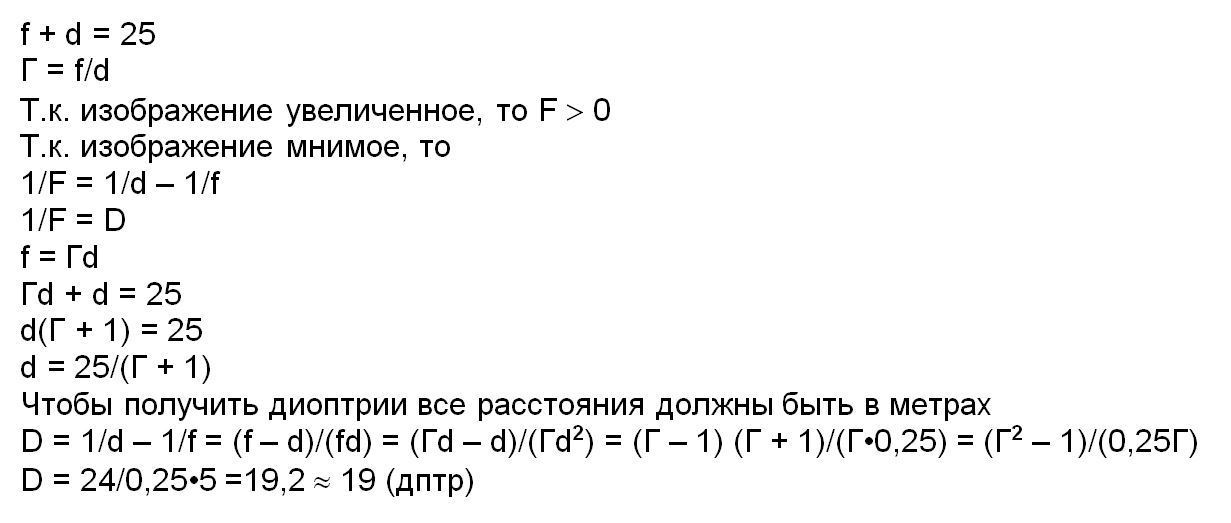 расстояние между предметом и его изображением L=25см. Если изображение мнимое , увеличенное , с увеличением Г=5, то оптическая сила линзы равна..... дптр (ответ округлите до целых)