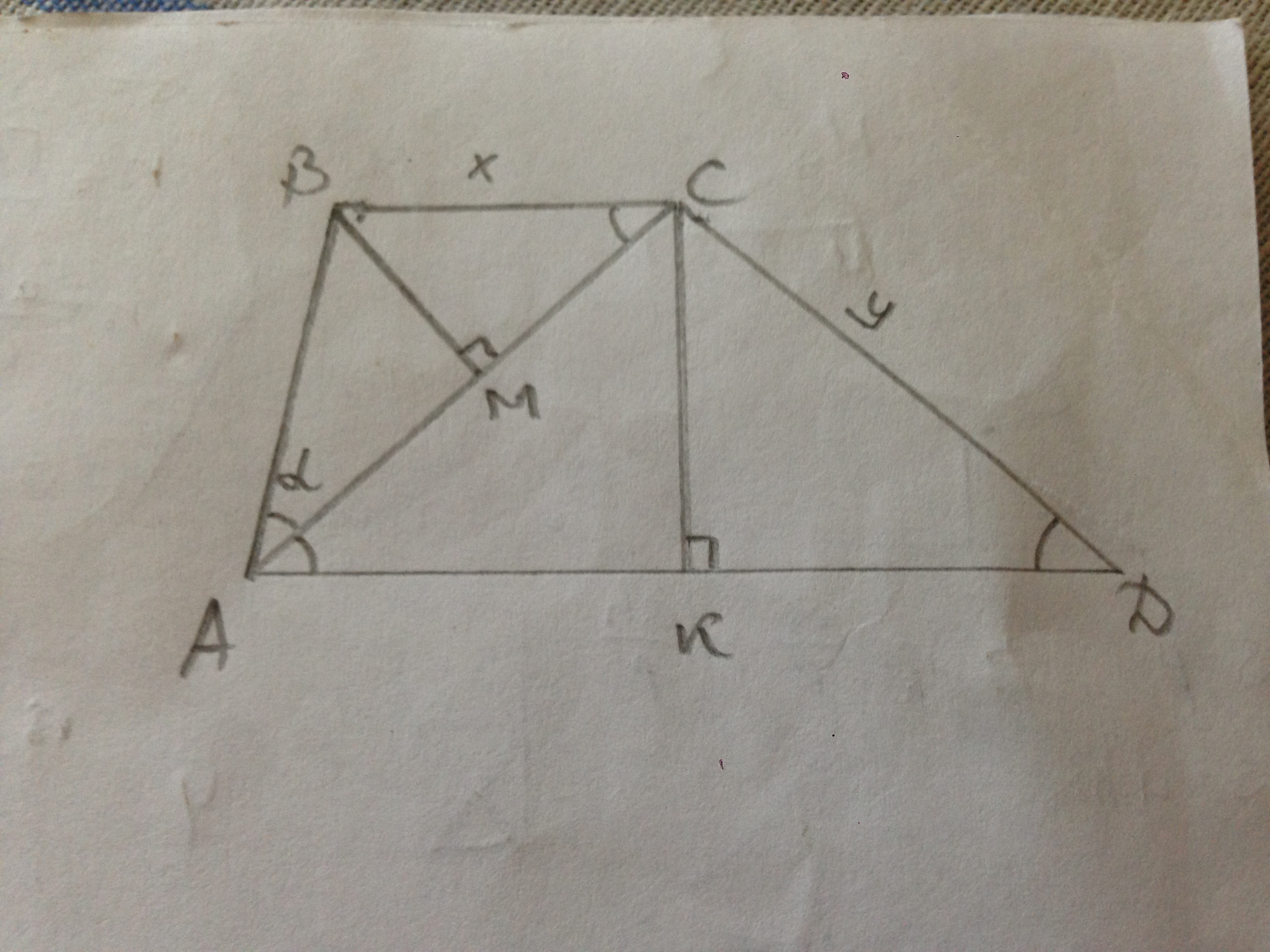 Пусть ∠ВАС=α, ВС=х, АС=у, тогда АМ=у/2, АД=ВС+СД=х+у.