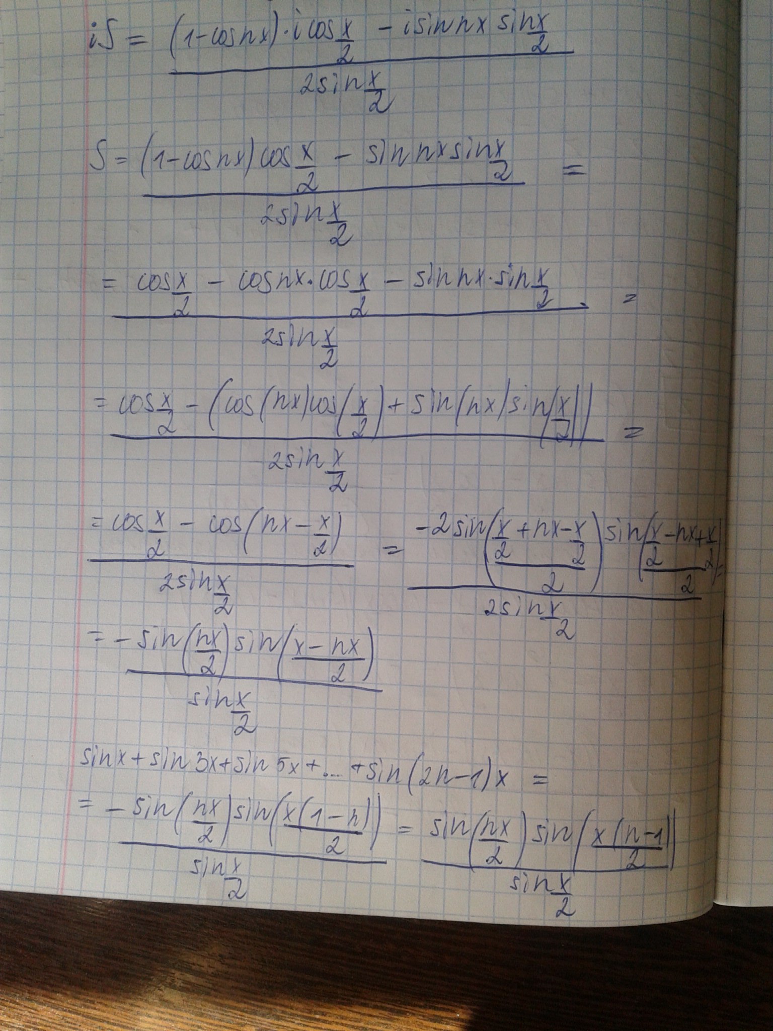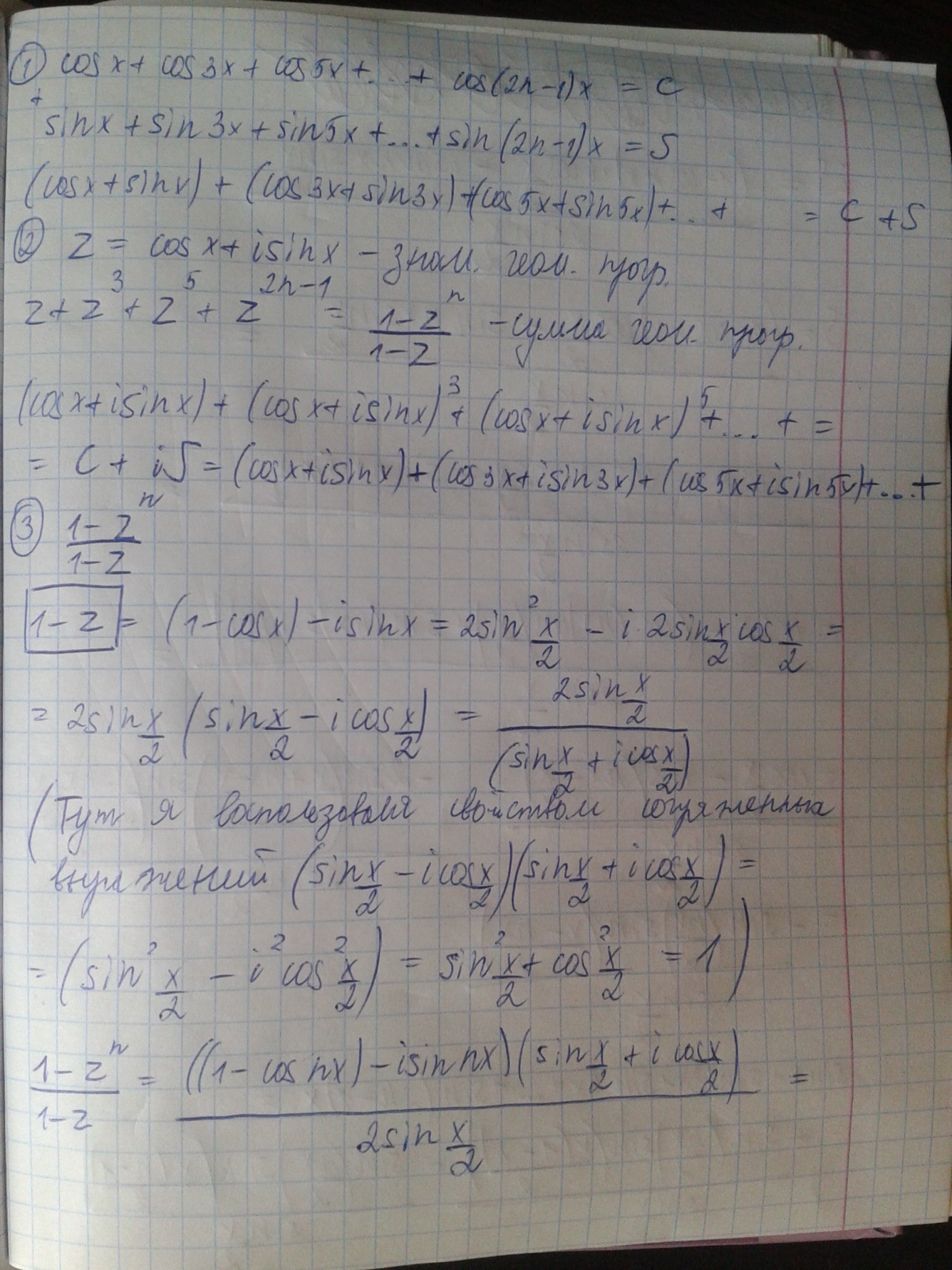 sinx + sin3x + sin5x + .. + sin (2n-1)x (найти сумму), как такое решать? складывал последнее и первое - не дало ничего. Это в параграфе про комплексные числа, так что возможно нужна формула муавра. Задача под всеми возможными звёздочками, поэтому прошу, если решили, то очень и очень доходчиво объясните. Удачи с ребусом.