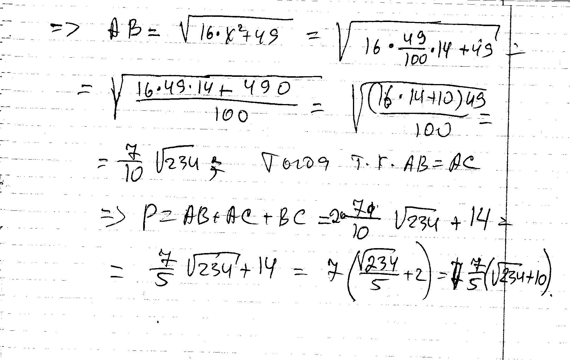 Нашел. Во втором листе, под корнем в числителе должно быть (16*14+100), я пропустил ноль. тогда Из-под корня выходит (7*18)/100=12,6. То есть АВ=АС=12,6. Тогда периметр = 12,6+12,6+14=39,2. Прошу прощения, что сразу не нашел.