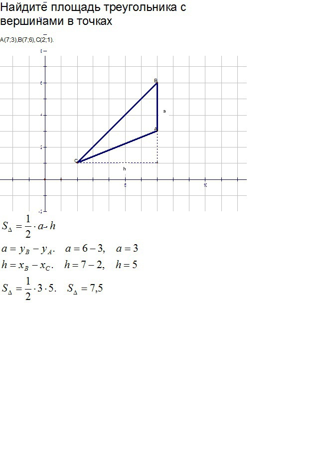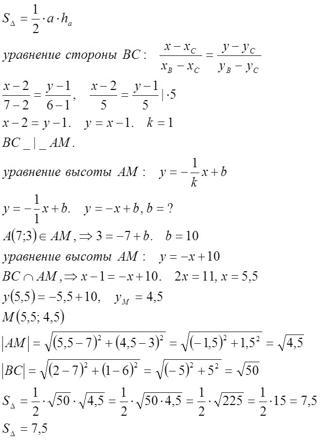 Найдём уравнение прямой, описывающей лини. BC (основание треугольника) y(x)=5*x/5-1 (здесь 5 в числителе - это расстояние между вертикальными координатами точек B и C, а 5 в знаменателе - расстояние между их горизонтальными координатами ). Общее уравнение прямой запишем как 1*y-1*x+1=0. Теперь расстояние между точкой А и прямой BC (высота треугольника) равна d=|-1*7+1*3+1|/√(1²+1²)=3/√2=2,121. Длина стороны ВС равна L=√(5²+5²)=√50=7,071. Теперь площадь треугольника ищем как полупроизведение основания ВС на высоту d, то есть S=0,5*7,071*2,121=7,5 единиц.