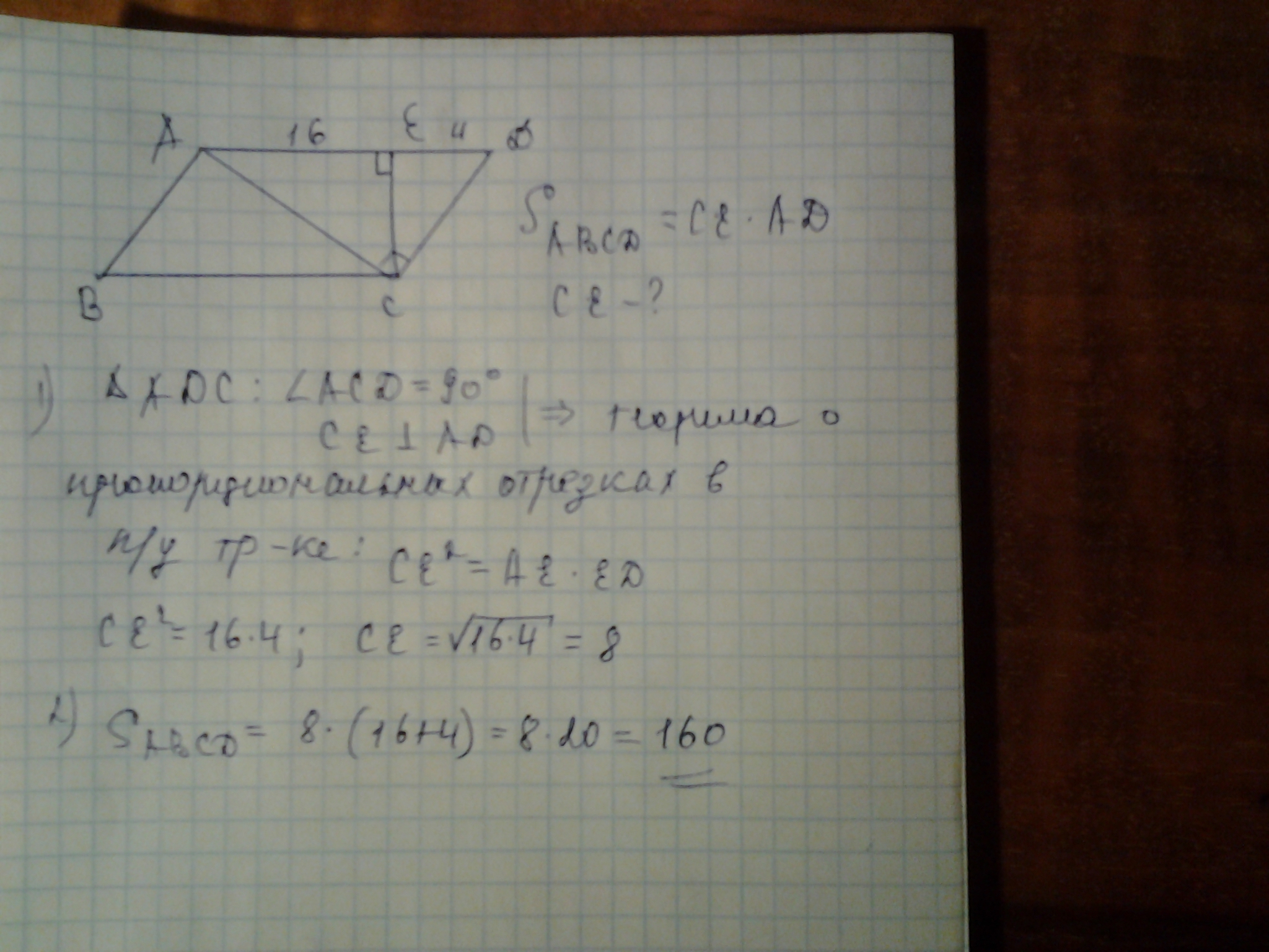 В параллелограмме АВСД АС перпендикулярно к СД (АС- диогональ), СЕ перпендикулярно к АД АЕ=16 ЕД=4, Найдите площадь параллелограмма. Можно рисунок а то не поянла