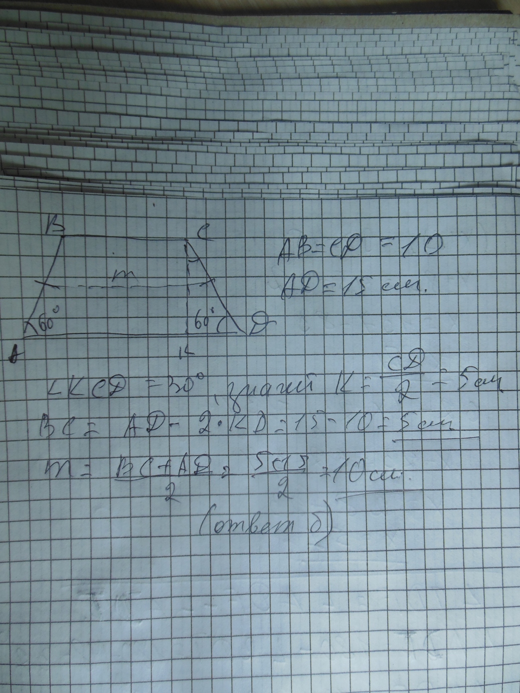 Помогите решить!!! В рівнобічній трапеции острые углы равны 60 градусов, боковая сторона равна 10 см, а большее основание 15см. Найдите меньшее основание и среднюю линию трапеции.