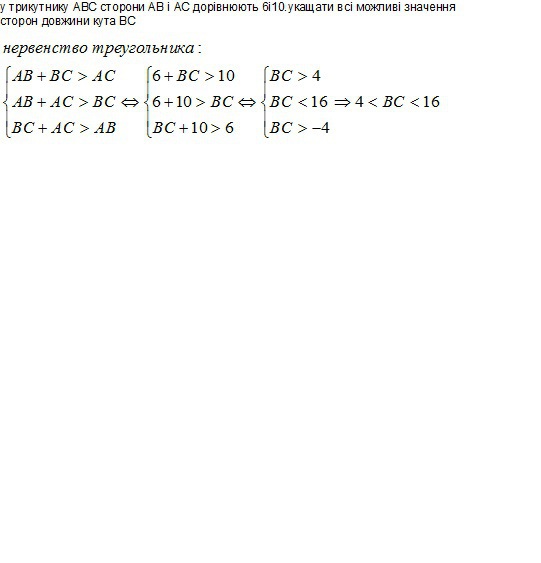 у трикутнику ABC сторони AB і AC дорівнюють 6і10.укащати всі можливі значeння сторон довжини кута ВС