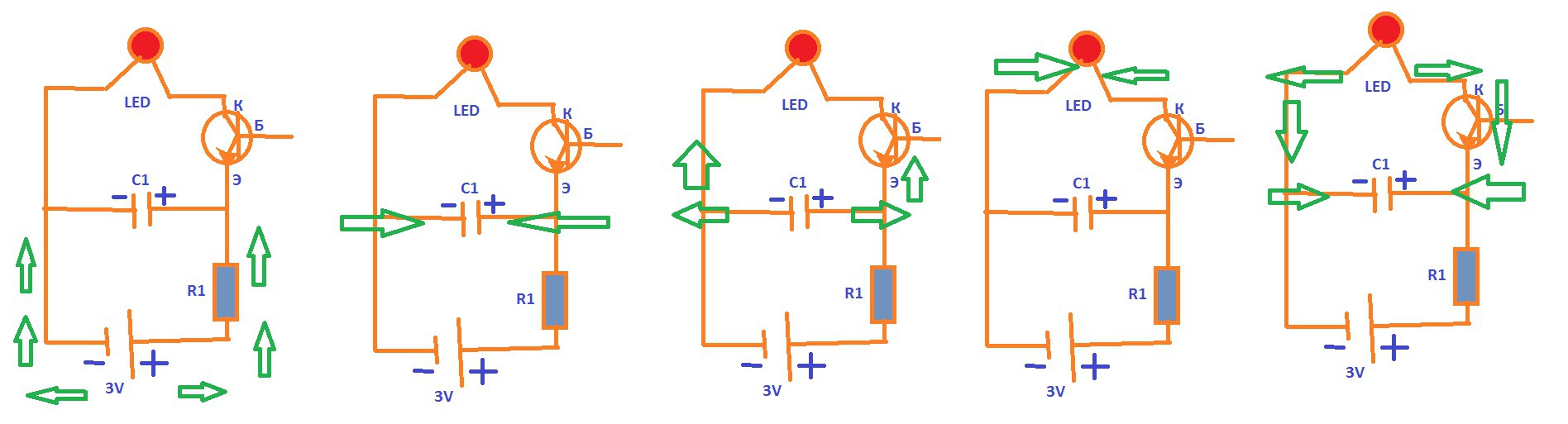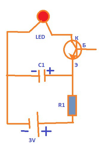 Первоначально конденсатор разряжен, следовательно считается, что его сопротивление очень мало (он сильно хочет зарядиться, как только найдет откуда). По мере заряда напряжение на обкладках конденсатора C1 будет возрастать. И как только оно достигнет значения, достаточного для отпирания перехода эмиттер-коллектор транзистора, через светодиод LED потечет ток разряда конденсатора. Светодиод начнет светиться. По мере разряда конденсатора напряжение на его обкладках будет убывать. Как только оно станет ниже порога "отсечки" перехода транзитора, переход запрется и ток прекратится. Светодиод погаснет, а конденсатор снова начнет процесс зарядки. Резистор R1 ограничивает зарядный ток конденсатора, определяя время задержки начала свечения LED.