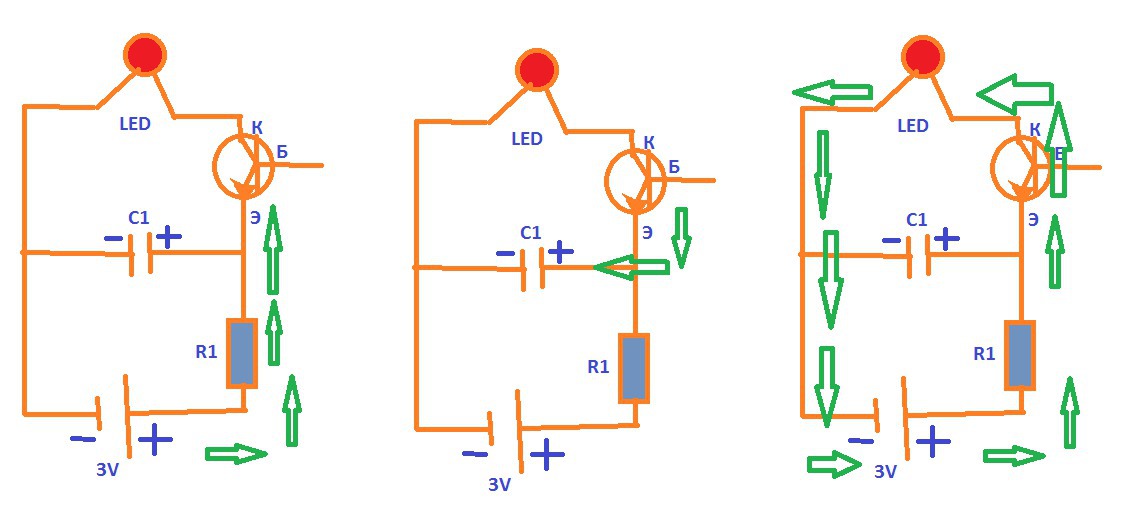 тогда заряды от источника питания с начало проходит резистор, потом только к правой обкладки конденсатора? , а потом транзистор и т.д? пример я привел на картинке "variant1"