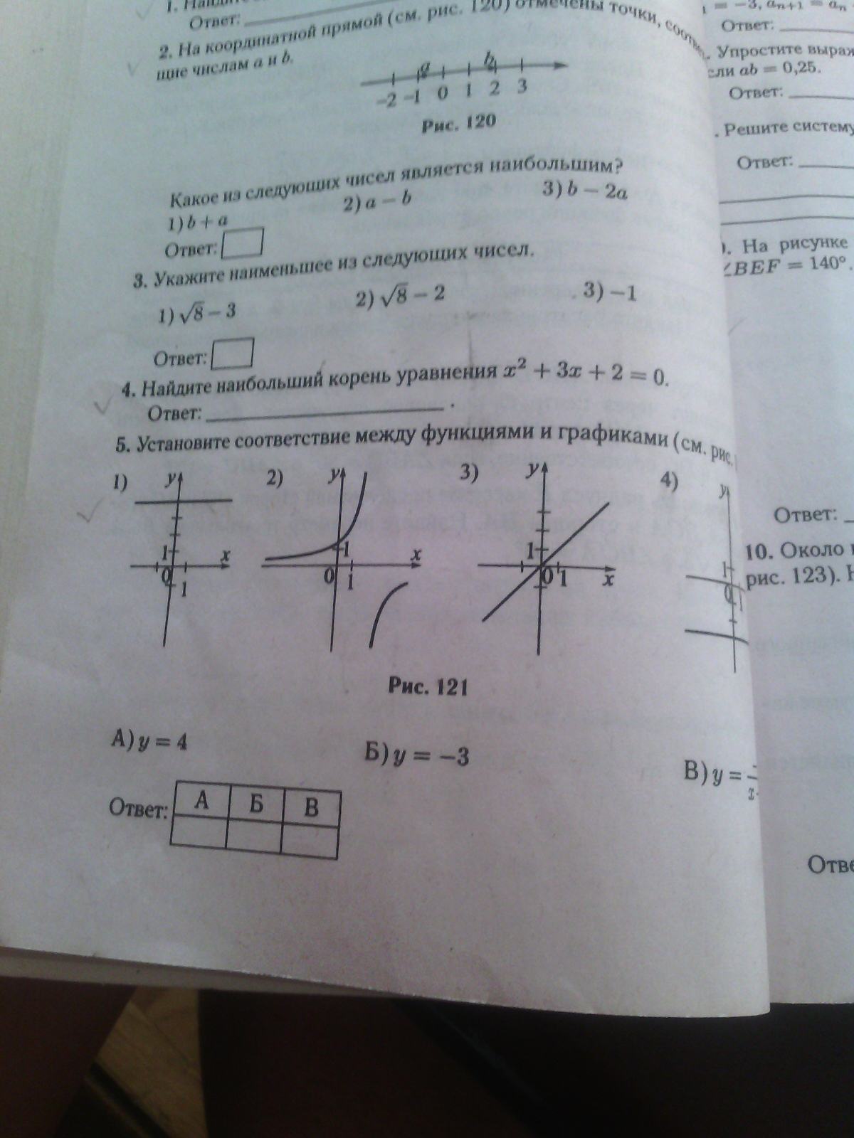 4.) Дискриминант равен 9-4*2=1=1^2. х1=(-3+1)/2=-1. х2=(-3-1)/2=-2. -1>-2. 5.) функция у=4 является параллельной оси х (горизонтальной оси) и находится выше нуля, так как 4>0. Подходит график 1. Функция у=-3 является параллельной оси х и находится ниже нуля, так как -3<0. График 4. Функция В (мне она не полностью видна) со знаменателем х, следовательно, это обратная пропорциональность, значит, график - гипербола.