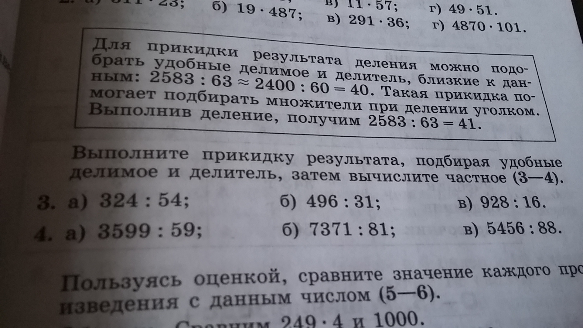 выполните прикидку результата подбирая удобные дельмое и делитель затем вычислите частное 324:54; 496:31; 928:16;