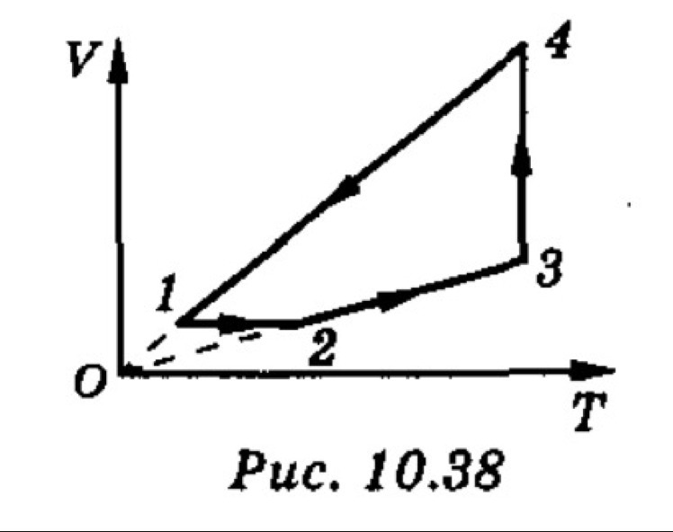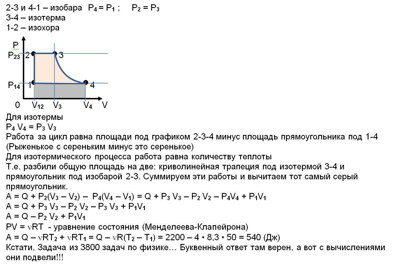 С 4 молями идеального газа совершают круговой процесс(см рисунок). На участке 3-4 газу передаётся количество теплоты Q34=2200Дж. Температуры в состояниях 1 и 2 : Т1 =373К, Т2=423К. Найти работу, совершаемую газом за цикл.