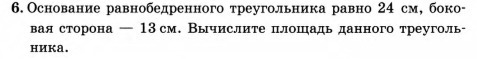 3) проведем высоту ВК (h) на основание АС; высота является медианой в равнобедренном треугольнике; значит: АК=24:2=12 см;