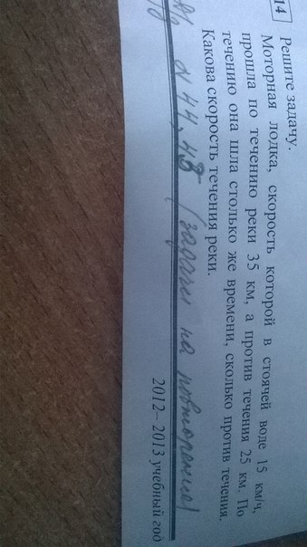 Скорость течения реки возьмем за x, значит скорость реки по течению будет равна x+15, а против течения 15-x(т.к движение против течения снижает скорость лодки)