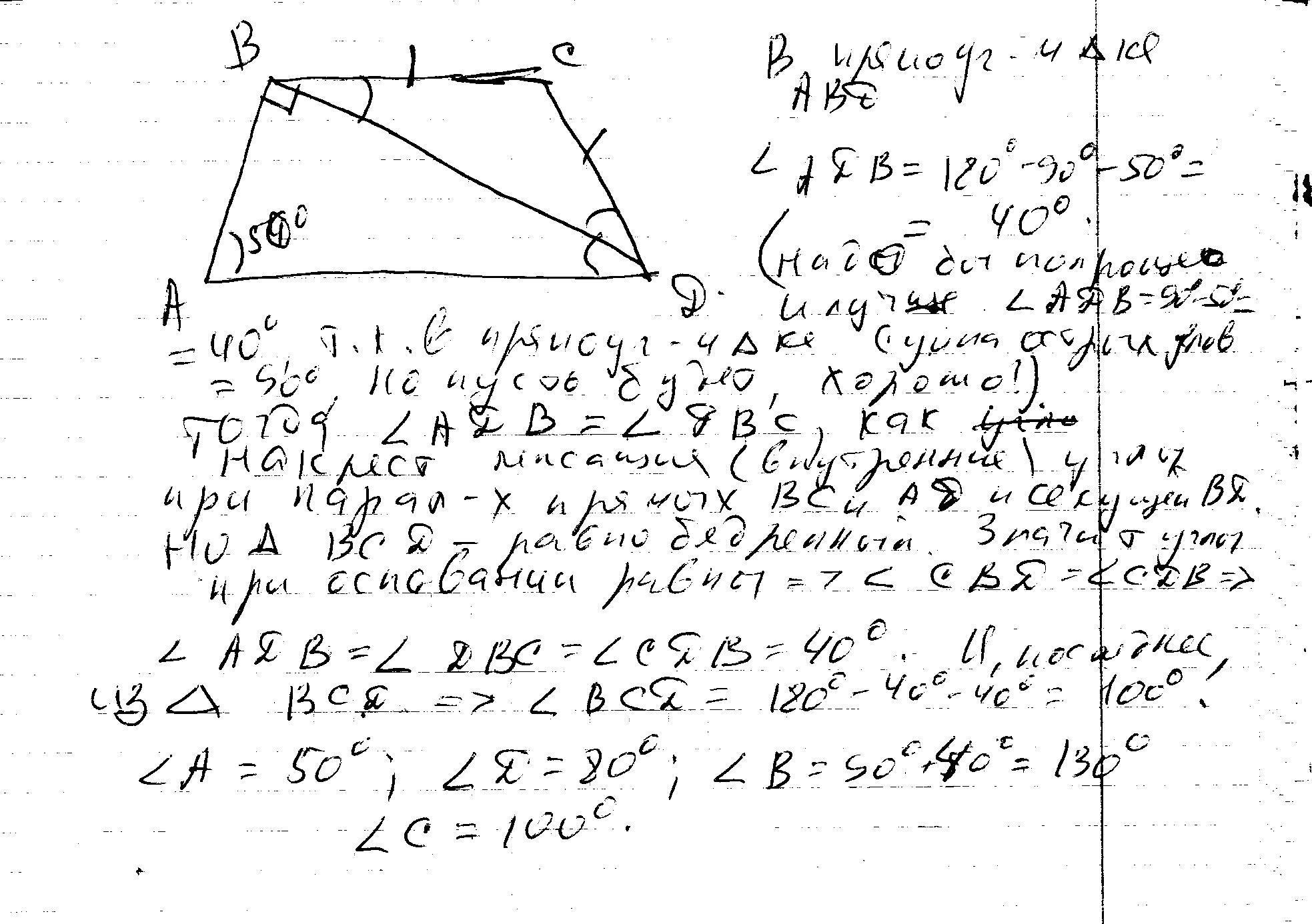 Помогите решить!!! Диагональ BD трапеции ABCD перпендикулярна к боковой стороне АВ, а основание ВС равна второй боковой стороне . Угол А равен 50 градусов . Найдите остальные углы трапеции.