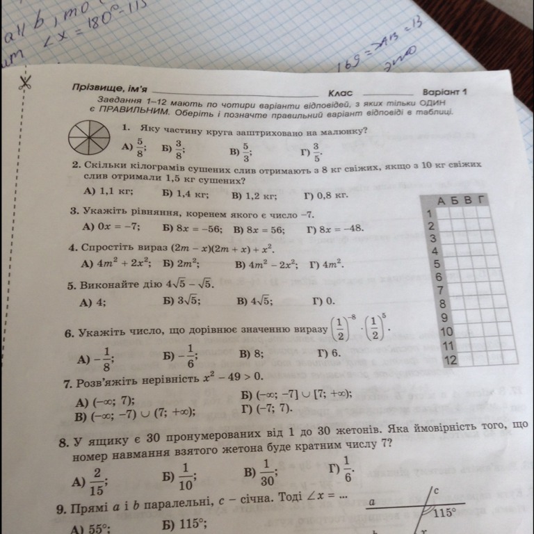 1. У тебе коло . У ньому можна нарахувати 8 частин (риски ) . Тобі потрібно порахувати сірі частини . Їх п'ять . Значить заштриховано 5 з 8. Відповідь : 5/8 (А)
