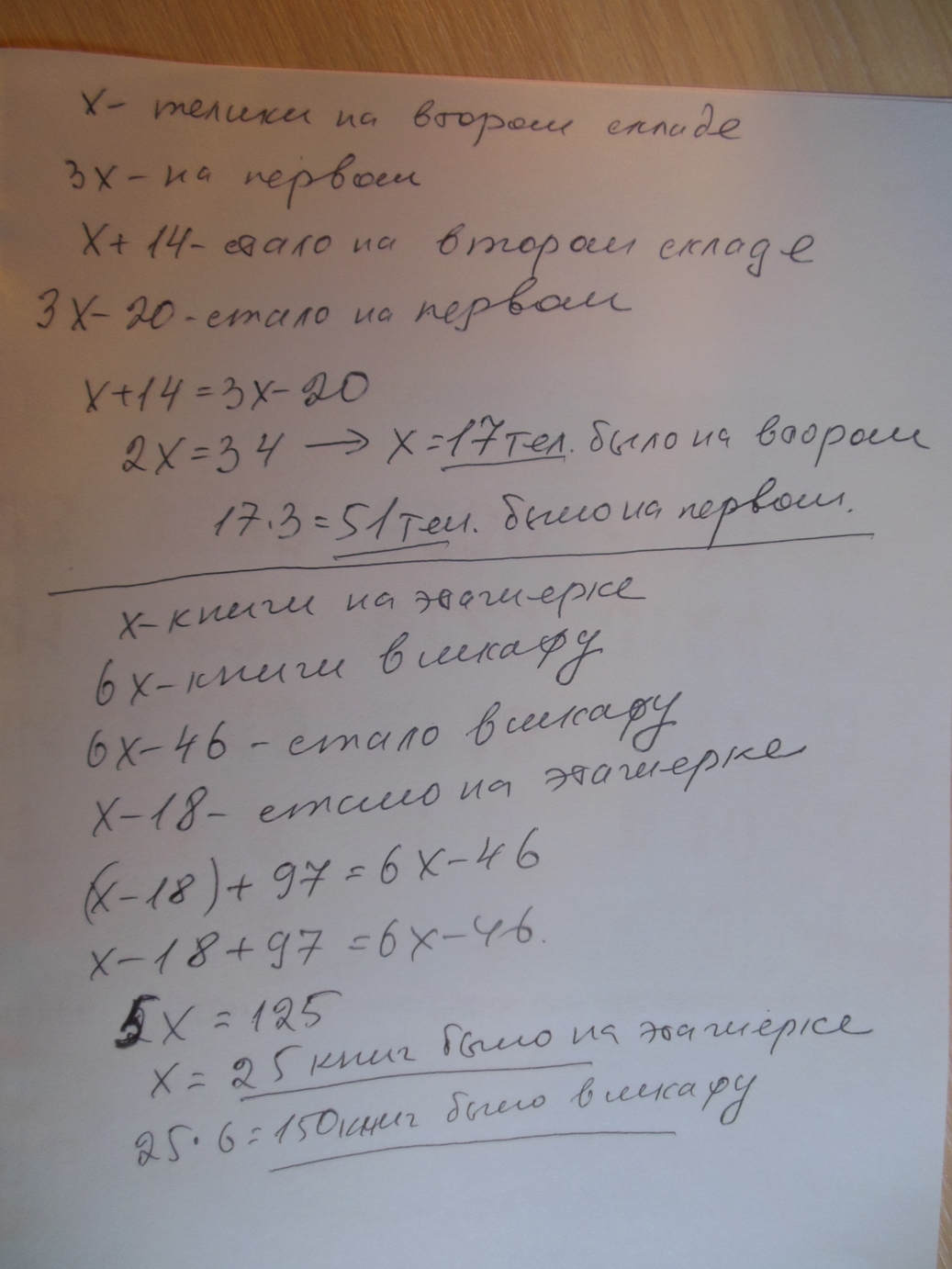 1.На одном складе было в 3 раза больше телевизоров, чем на другом. После того как с первого склада взяли 20 теликов а на второй привезли 14 то на обоих скаладах стало поровну. Сколько теликов было сначала на каждом складе
