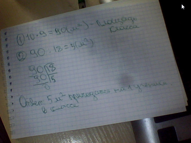 длина класса 10 м, ширина 9 м. В классе 18 учеников. Сколько квадратных метров площади класса приходится на каждого ученика?