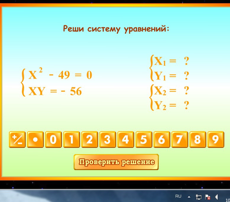 х²-49=0 можно записать как х²=49, тогда х будет равен х₁=7 и х₂=-7, так как и первый и второй корень при возведении в квадрат дадут 49. Зная значение х можем найти у. Подставим значение х во второе уравнение системы и получим: 7*у₁=-56; у₁= -56:7= -8; и второй корень -7*у₂=-56; у₂=-56:(-7) =8. Ответ: х₁=7; у₁=-8; х₂=-7; у₂=8