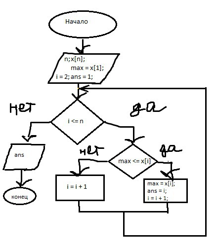 Изначально берем за максимум первый элемент массива X, затем проходимся по всем элементам массива и если выполняется условие (текущий максимум ≤ текущий элемент массива), то обновляем ответ.