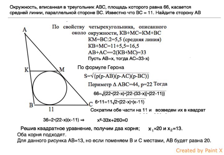 Окружность, вписанная в треугольник ABC, площадь которого равна 66, касается средней линии, параллельной стороне BC. Известно что BC = 11. Найдите сторону AB
