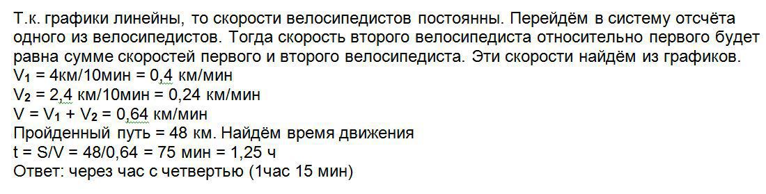 На рисунке приведены графики зависимости путей, пройденных велосипедистами, от времени. Через какой промежуток времени после начала движения расстояние между велосипедистами станет L=48 км?