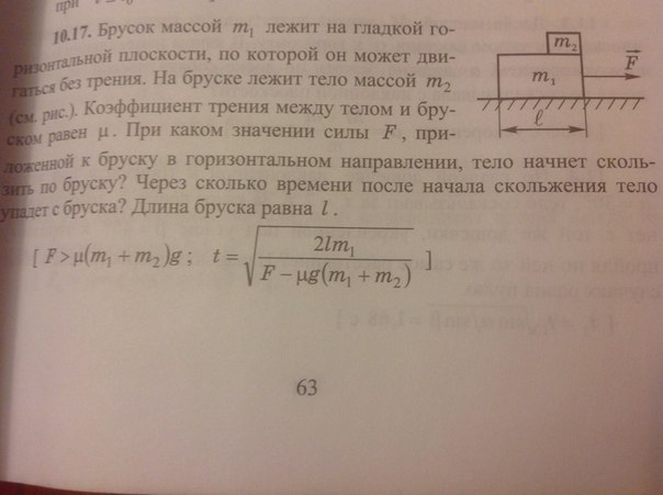 ускорения у тела и бруска могут быть различными если тянуть за брусок достаточно сильно. брусок передает через силу трения телу часть внешней силы, но сила трения не может превышать u*m2*g, это значит что вместе они будут двигаться с ускорением не большим чем u*g. если на два тела действовать силой F > (m1+m2)*u*g то нижний брусок будет проскальзывать относительно верхнего тела