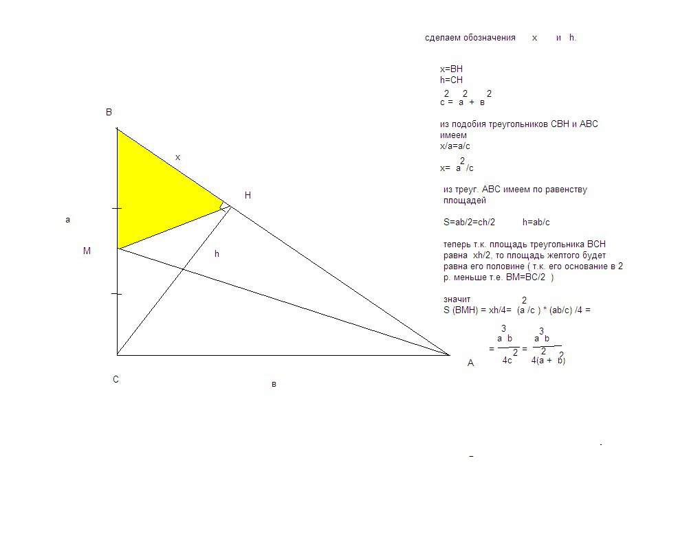 в прямоугольном треугольнике abc катет ac равен b катет bc равен a, ch высота am медиана тогда площадь треугольника bmh равна. Формулу знаю, кто может показать как она выводится? заранее спасибо