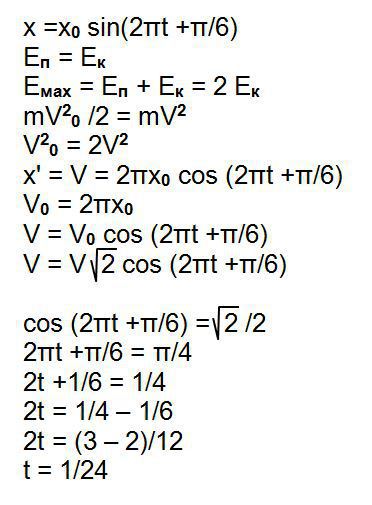 Материальная точка совершает колебания по закону x =x0 sin(2πt +π/6) см. В какой момент времени ее потенциальная энергия равна кинетической?