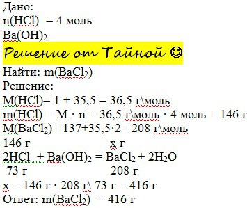 2HCl+Ba(OH)₂ =BaCL₂ +2H₂O из 2 моль HCl получается 1 моль соли, т.е. в 2 раза меньше моль, следовательно, из 4 моль HCl получится 2 моль BaCL₂