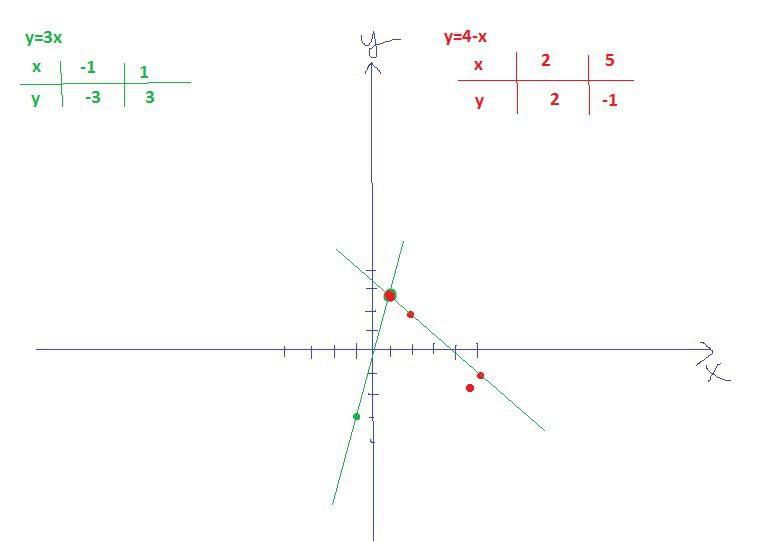 Приравняем правые части: 3х=4-х; решаем: 3х+х=4; 4х=4⇒х=1