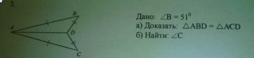 Так как сторона AD для обоих треугольников является общей, а остальные стороны по условию равны, то данные треугольники равны по третьему признаку равенства треугольников. Отсюда ∠C=∠B=51°.