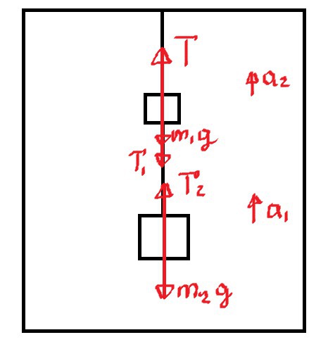 к потолку движущегося лифта на нити подвешена ниря массой 1 кг. К этой гире пртвязана другая нить на которой подвешена ниря массой 2 кг.Найдите силу натяжения верхней нити если сила натяжения нити между гирями равна Т0=10Н