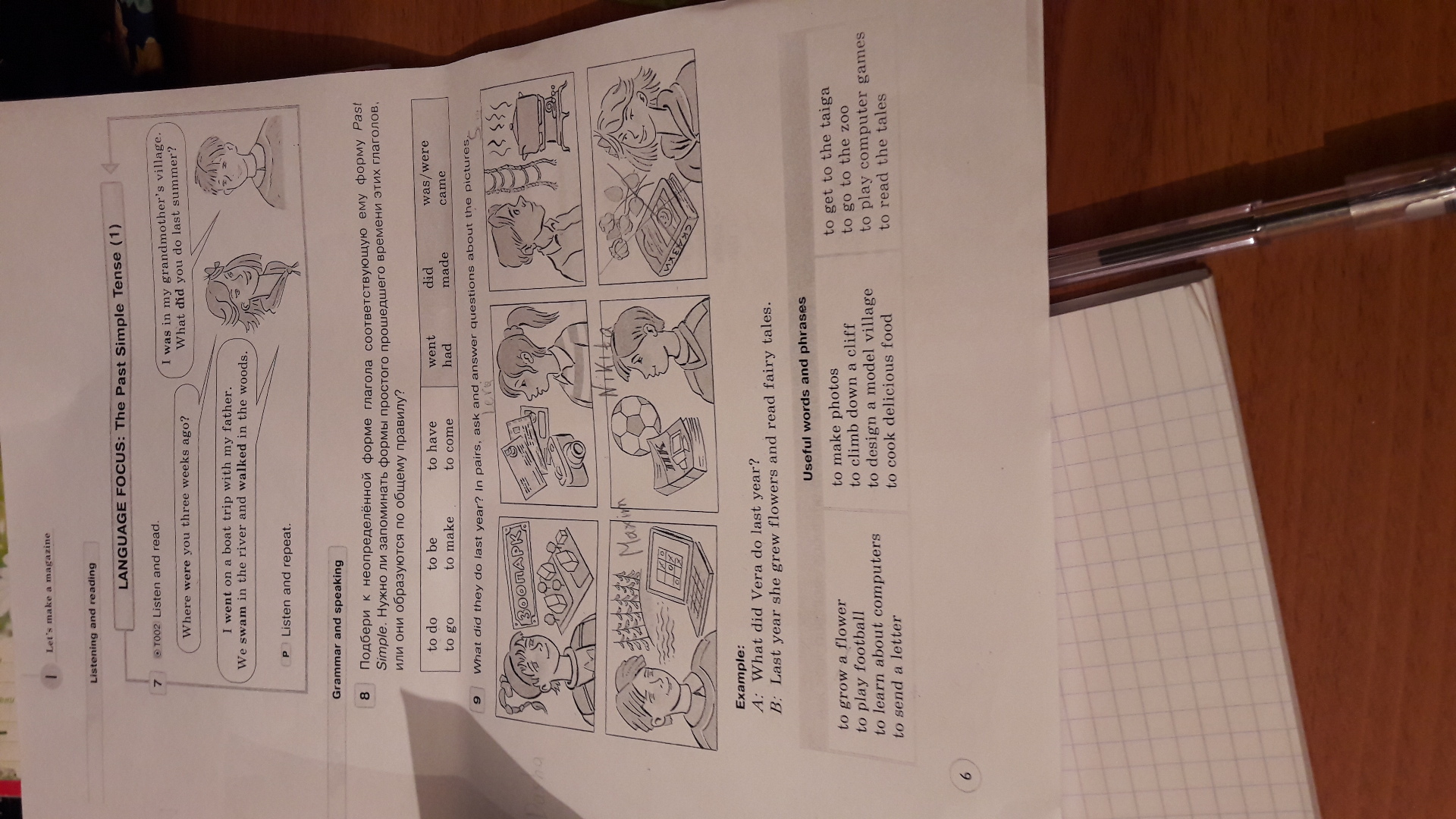 Задание 8. To do - did, to go - went, to be - was/were, to make - made, to have - had, to come - came. Да, необходимо запоминать эти формы. Задание 9. 1. - What did Anna do last year? - Last year she went to the zoo and designed a model village. 2. - What did Lera do last year? - Last year she sent a letter and made photos. 3. - What did Sam do last year? - Last year he climbed down a cliff and cooked delicious food. 4. - What did Maxim do last year? - Last year he got to the taiga and played computer games. 5. - What did Nikita do last year? - Last year he played football and learned about computers.