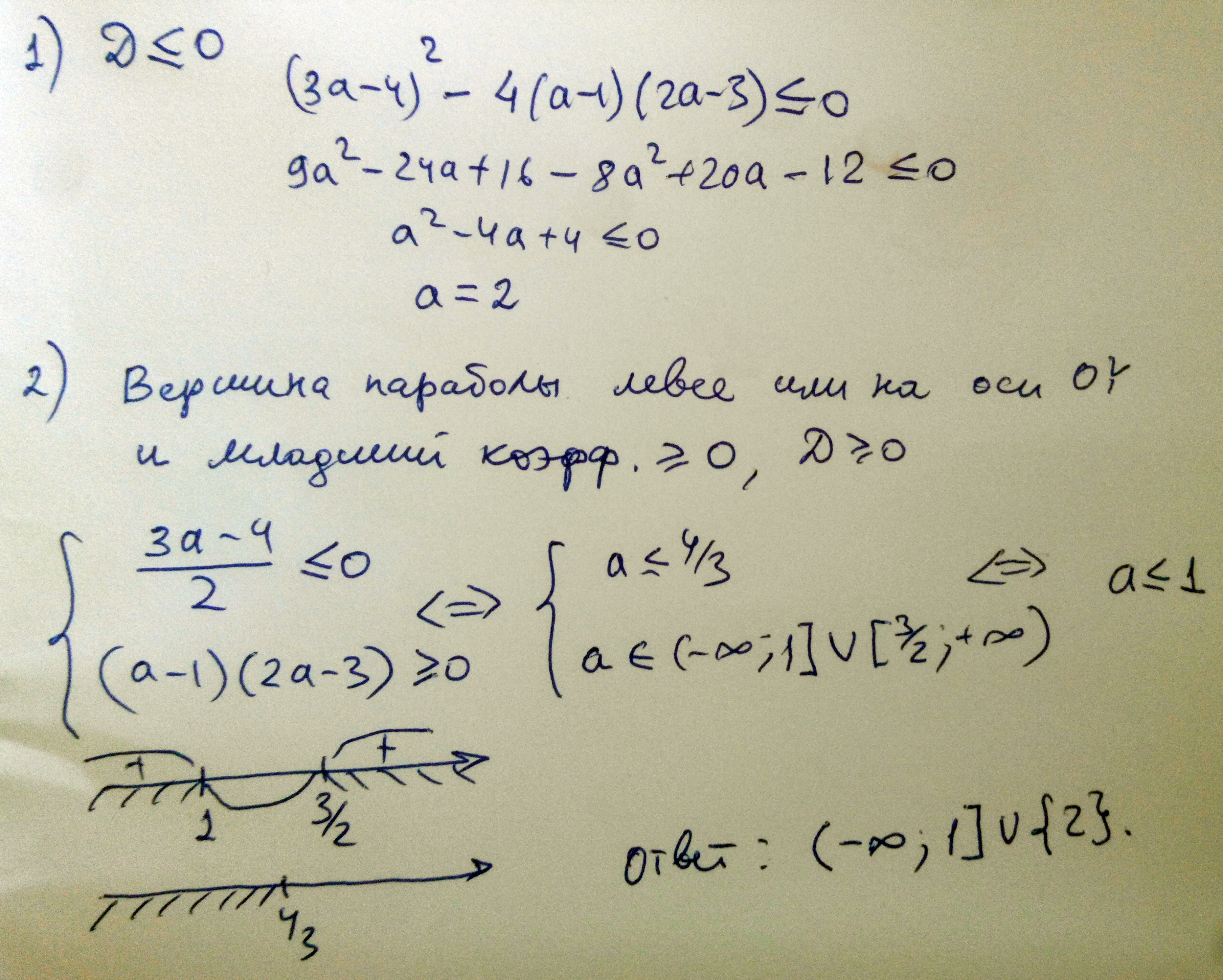 D=(3a-4)²-(4a-4)(2a-3)=9a²-24a+16-8a²+12a+8a-12=a²-4a+4=(a-2)²≥0