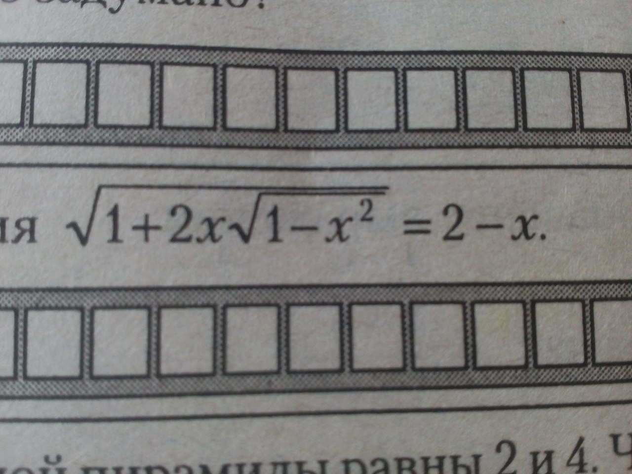 sqrt{1+2x sqrt{1- x^{2} } } =2-x \ sqrt{(x+ sqrt{1- x^{2} })^2 } =2-x \ |x+ sqrt{1- x^{2}}|=2-x \ \ 1)x+ sqrt{1- x^{2}}=2-x \ 2)x+ sqrt{1- x^{2}}=x-2 \ \ \ 1)x+ sqrt{1- x^{2}}=2-x \ \ sqrt{1- x^{2}}=2-2x textless  = textgreater  left { {{2-2x geq 0} atop {1- x^{2} =4-8x+4 x^{2} }} right. \ \ left { {{2x leq 2} atop {5 x^{2} -8x+3=0}} right.   left { {x leq 1} atop {5 x^{2} -8x+3=0}} right.  \ \ 5 x^{2} -8x+3=0 \ \ D=64-4*5*3=64-60=4=2^2 \ \