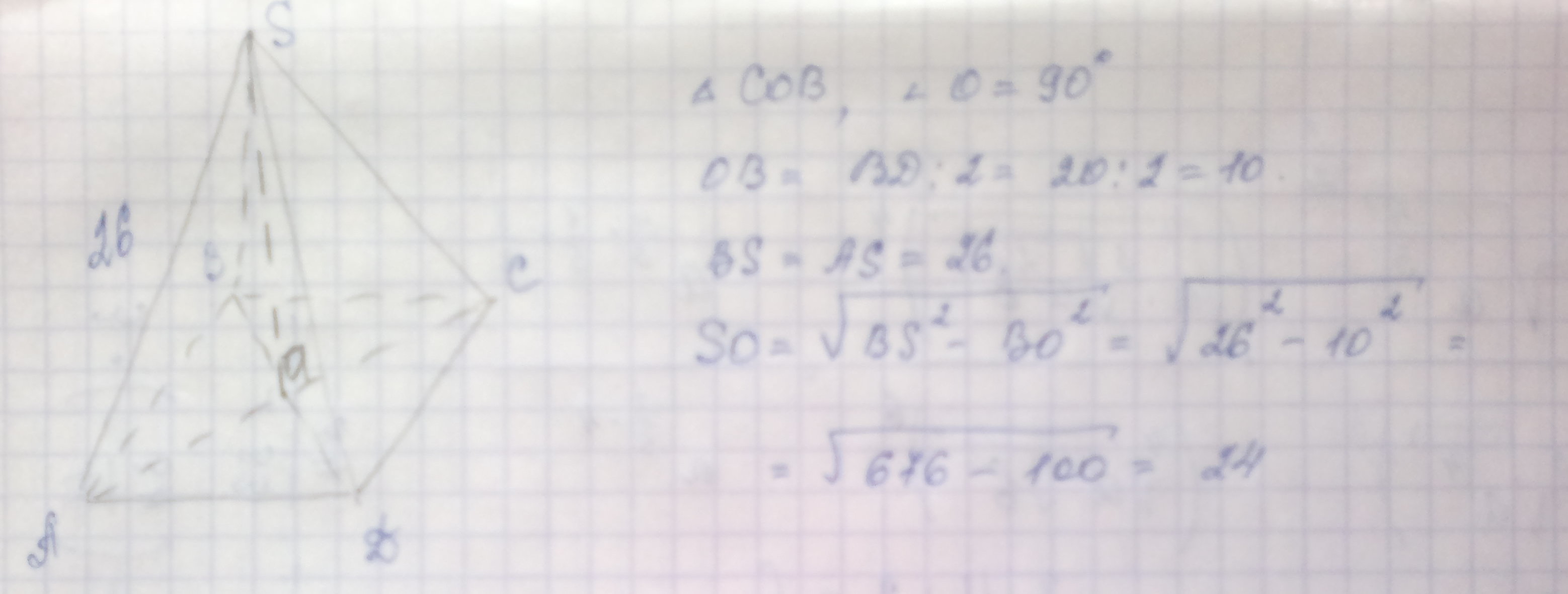 В правильной четырехугольной пирамиде SABCD точка О — центр основания, S вершина, SA = 26 , BD = 20. Найдите длину отрезка SO.